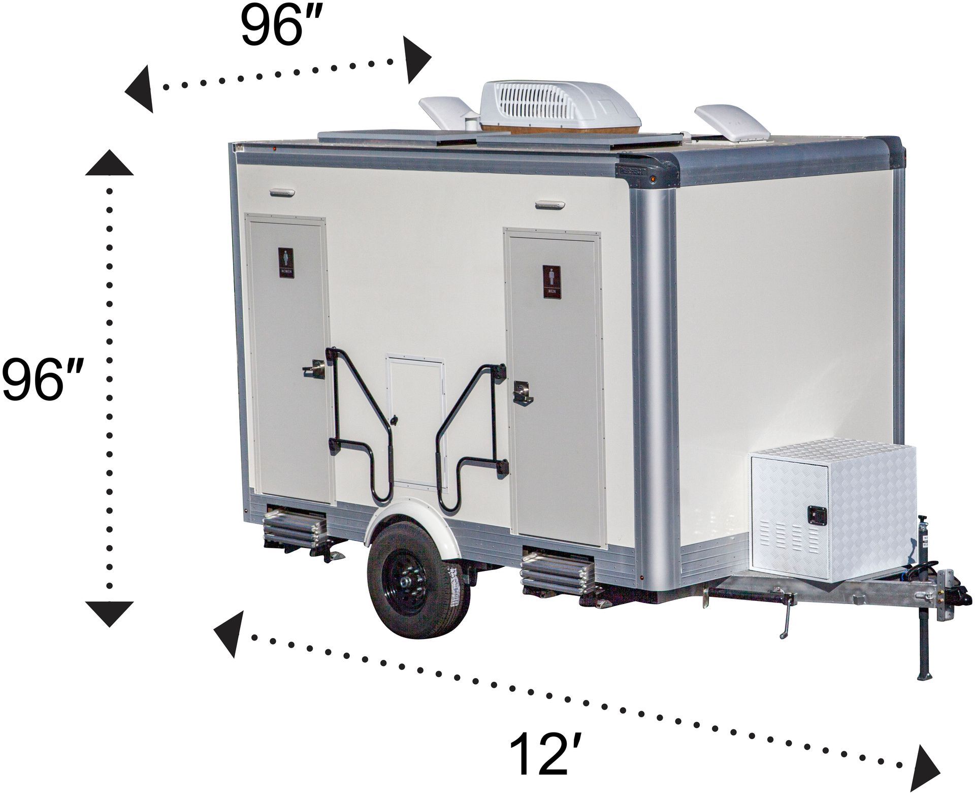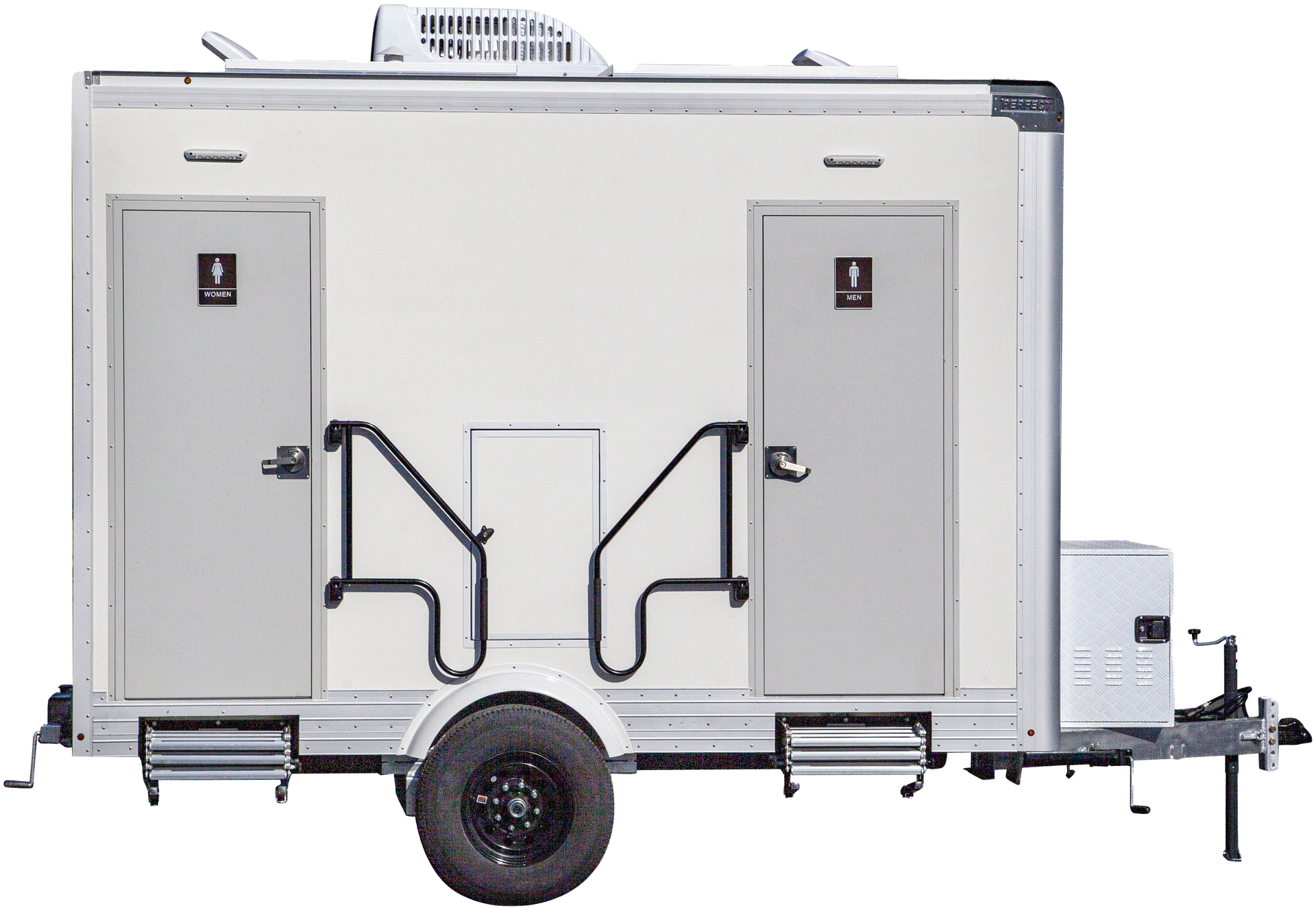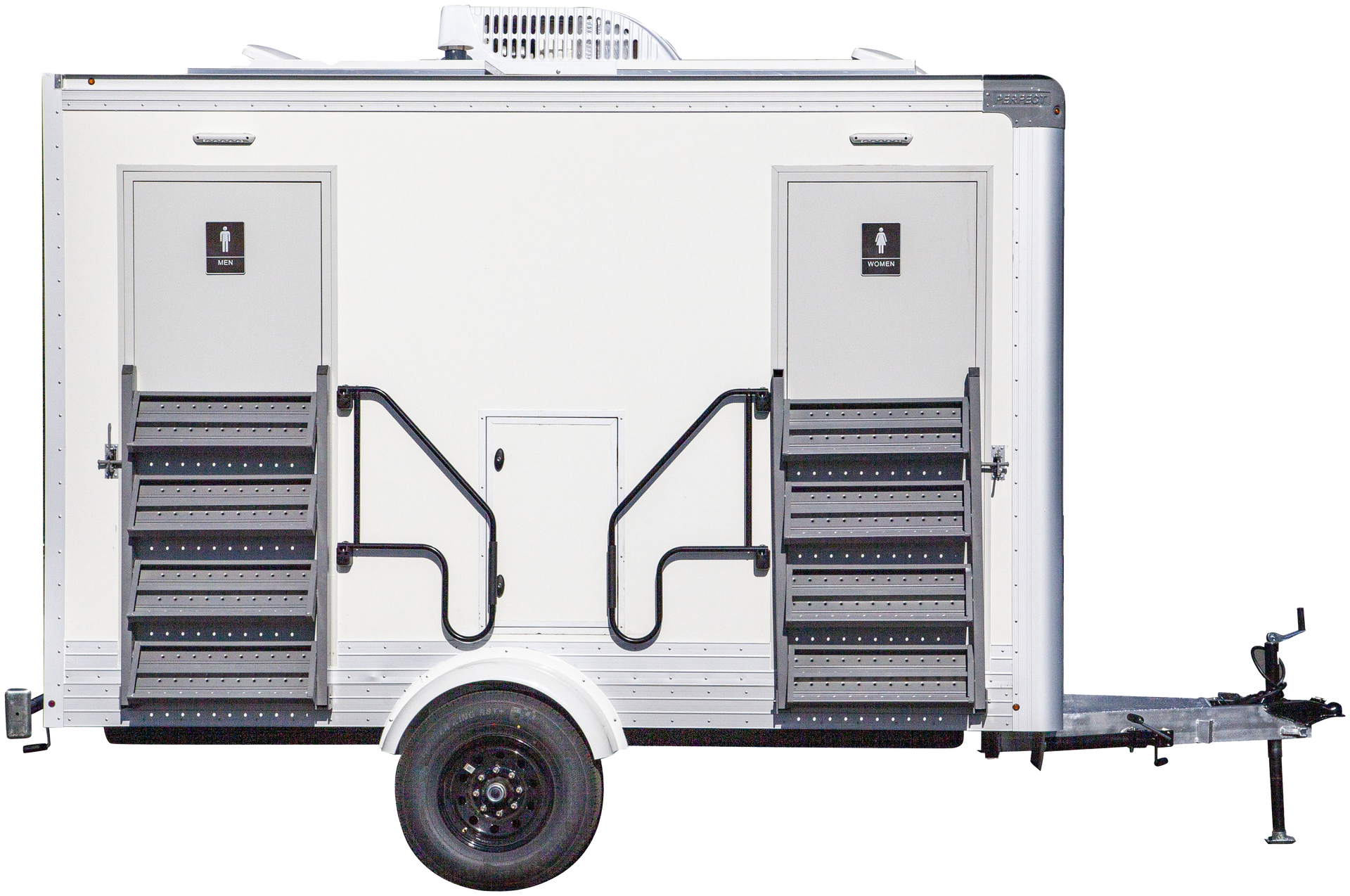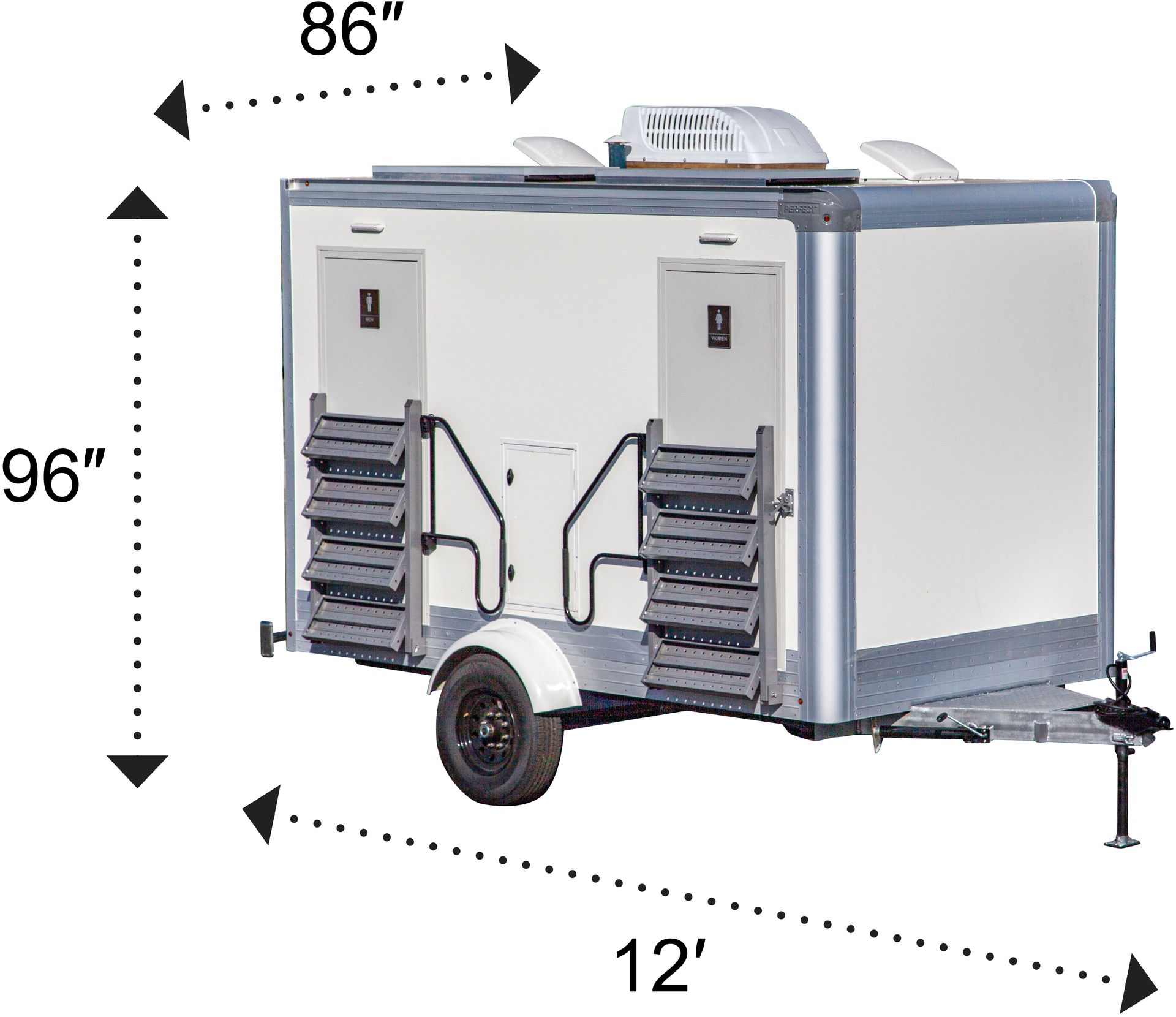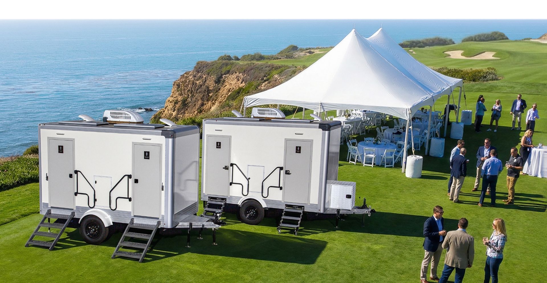 The PP12A 2-station trailer provides separate women’s and men’s facilities with porcelain fixtures, climate control, and premium finishes in a compact, easy-setup design ideal for upscale events.